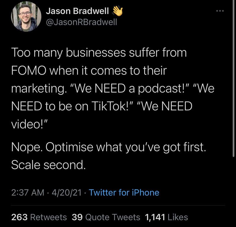 “Too many businesses suffer from FOMO [Fear of Missing Out] when it comes to their marketing. ‘We NEED a podcast!’ We NEED to be on TikTok!’